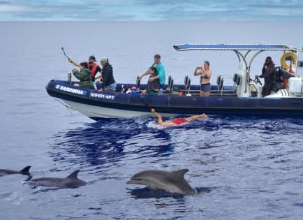 Schauen Sie sich unsere spezielle Tour an, bei der Sie – sofern die Bedingungen es erlauben – mit Delfinen im offenen Meer schwimmen können.
